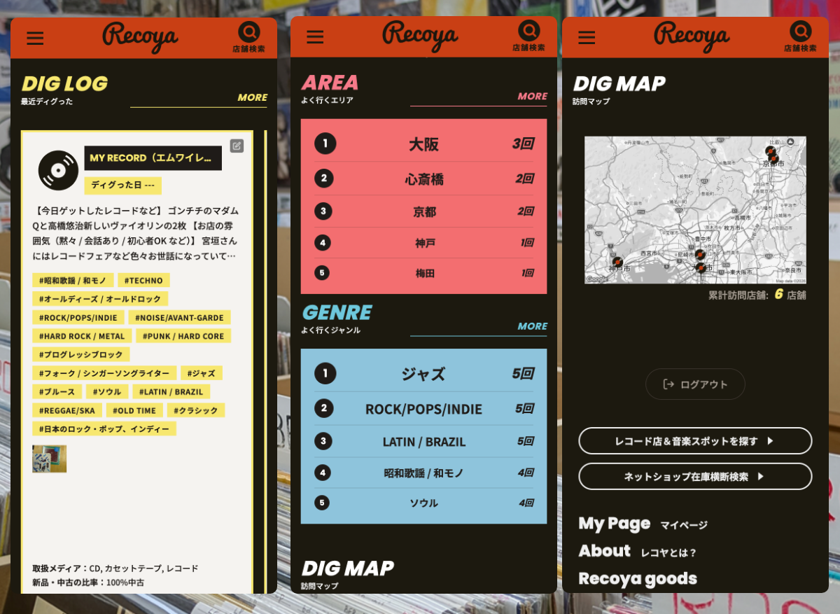 マイページでは、そうした日々のレコ屋体験を、あとから振り返れる形で残せます。